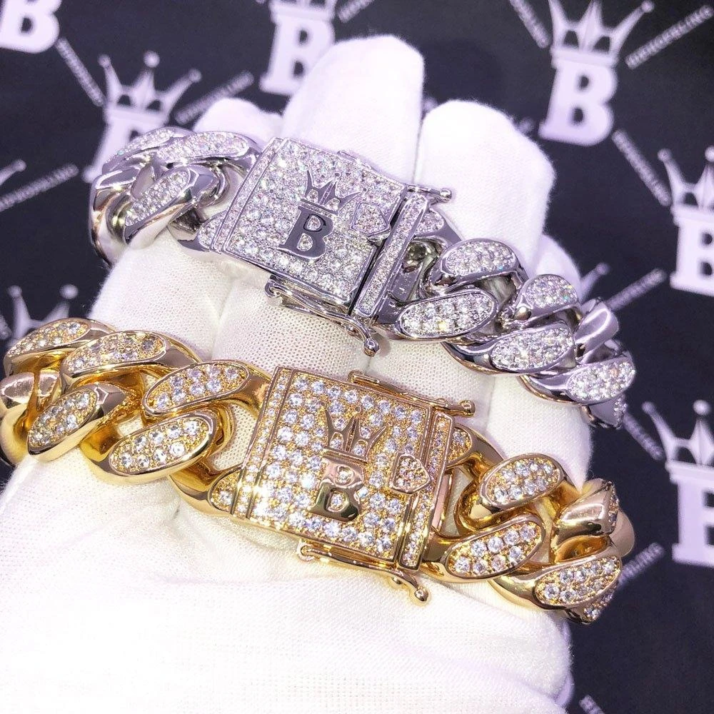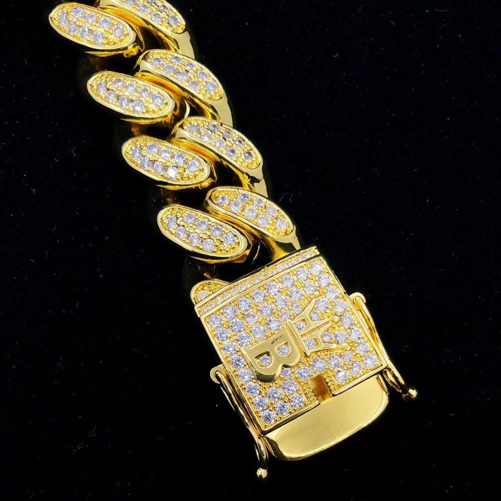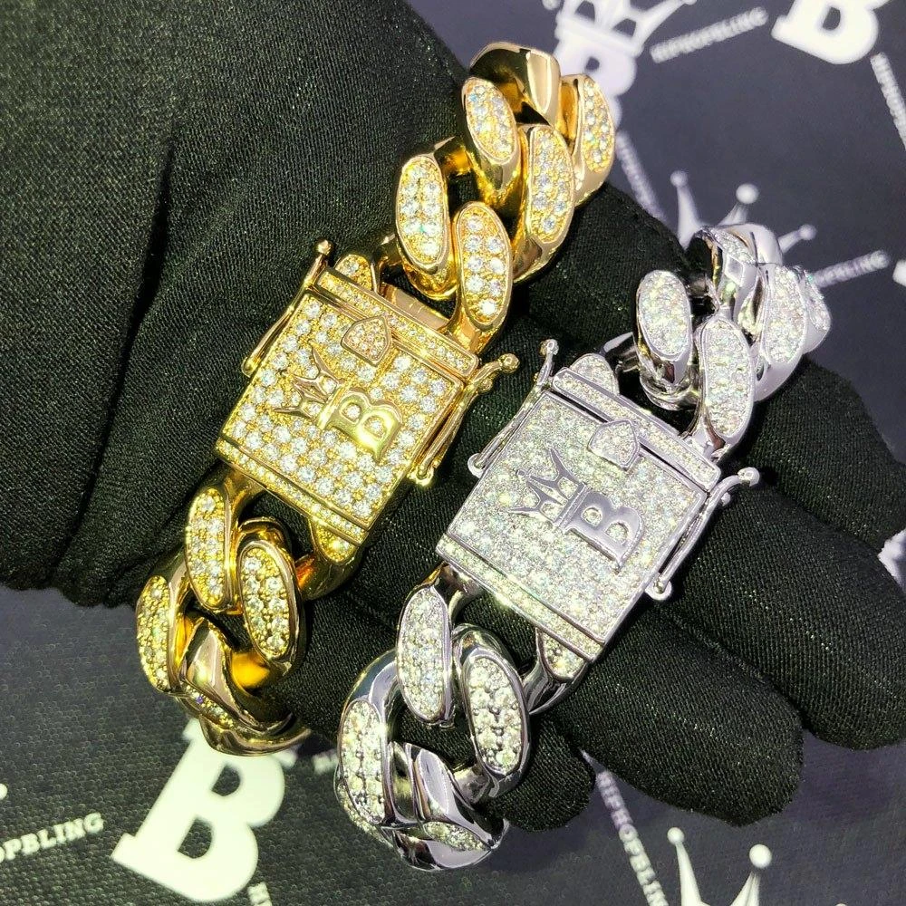 HIPHOPBLING 20MM Miami Cuban Link Hip Hop Bling Bling Bracelet. Features a secure triple lock Iced Out Clasp with the Hip Hop Bling Logo. Highly detailed with intricate details and stone setting. All stones are VVS Simulated Diamonds that are prong set. HIPHOPBLING Offering you the Best Hip Hop Jewelry Since 2003