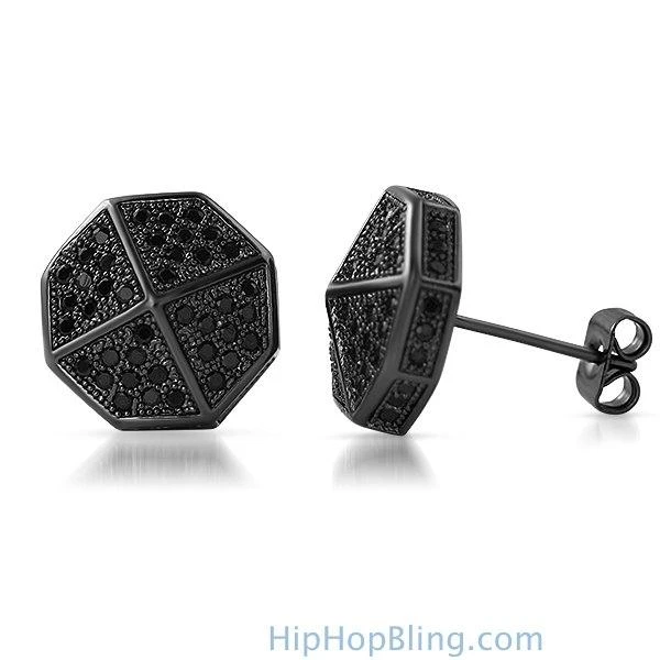 3D Pointed Octagon Black CZ Hip Hop Earrings
