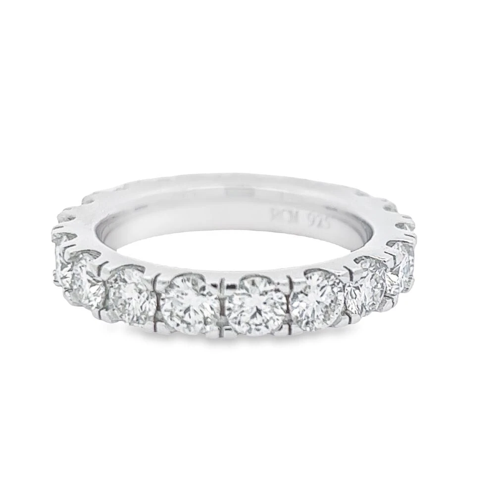 4MM Eternity Band 5.40cttw VVS Moissanite Ring .925 Sterling Silver. Features a polished comfort fitting solid back. This iced out Moissanite 360 eternity band ring is simply breathtaking and displays an incredible bling bling shine. We insisted on using the finest Moissanite stones available to craft this perfect high end ‘diamond’ bling bling Moissanite Micro Pave unisex eternity band. Moissanite stones are carbon based stones just like real Diamonds. The benefit of our Moissanite hip hop jewelry is that you get a better shine for much less money than genuine Diamonds. Our Moissanite Stones have a higher refractive index than real Diamonds and rank 9-9.5 on Mohs hardness scale.