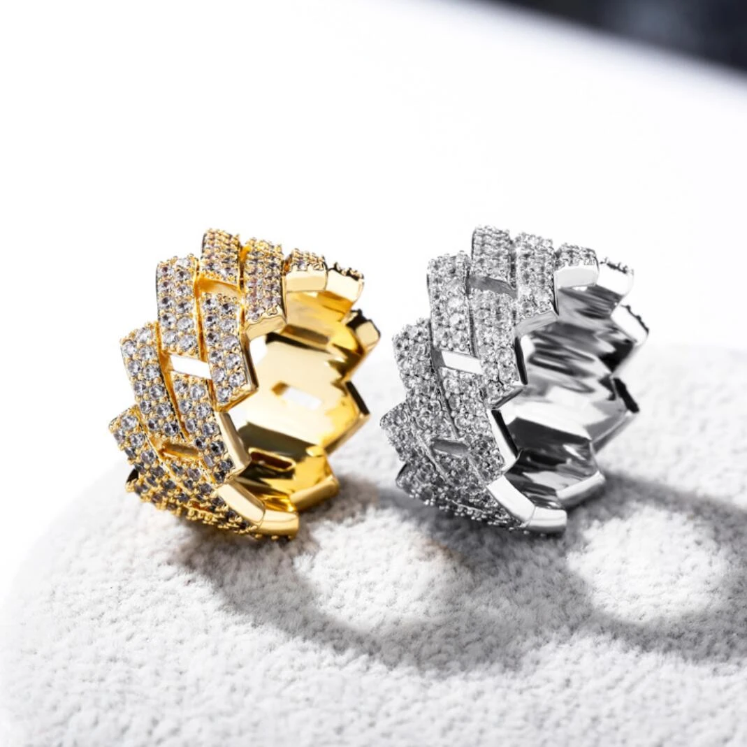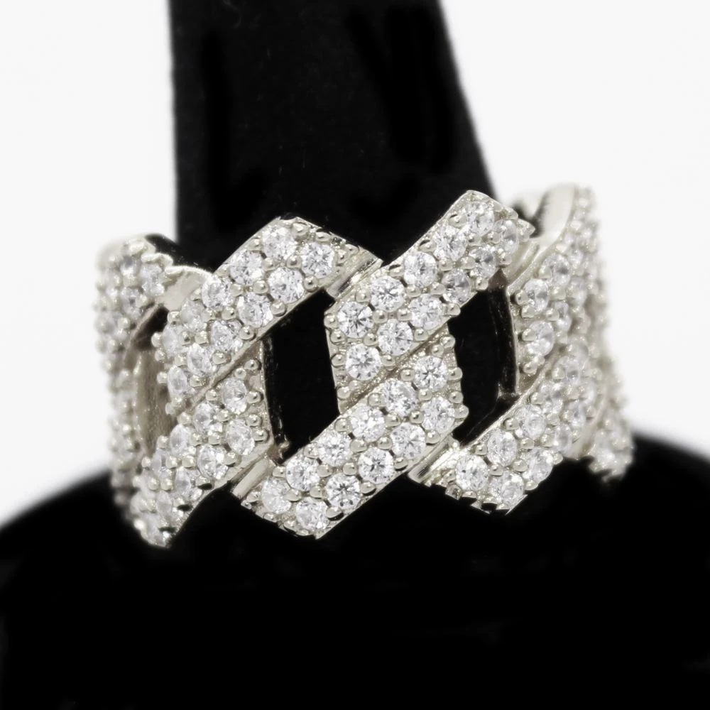 .925 Silver Sharp Cuban CZ Hip Hop Bling Ring. Crafted from Fine .925 Sterling Silver and Dipped in White Gold or Yellow Gold. Heavy weight with Solid Back. The VVS CZ Simulated Diamonds have a bling bling shine as if they were genuine diamonds. HipHopBling Quality Crafted to look and feel like Genuine Diamond Hip Hop Jewelry. Diamond Versions also available for order.