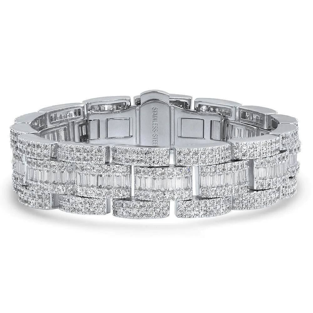 Baguette Oyster Link Custom CZ Iced Out Hip Hop Bracelet. Classic and Unique Style Bling Bling Bangle Bracelet. Hidden butterfly buckle so the ice is continuous around the iced out bracelet. High end quality setting to maximize bling bling shine and look expensive. Incredibly icy with VVS simulated diamond stones lighting up your wrist with the best shine possible. This iced out Bracelet shines like genuine diamonds. All hand setting, no glue. Hand Crafted to look, feel, and Shine Like Genuine Diamond Hip Hop Jewelry. Shine with the best hip hop jewels in the game.