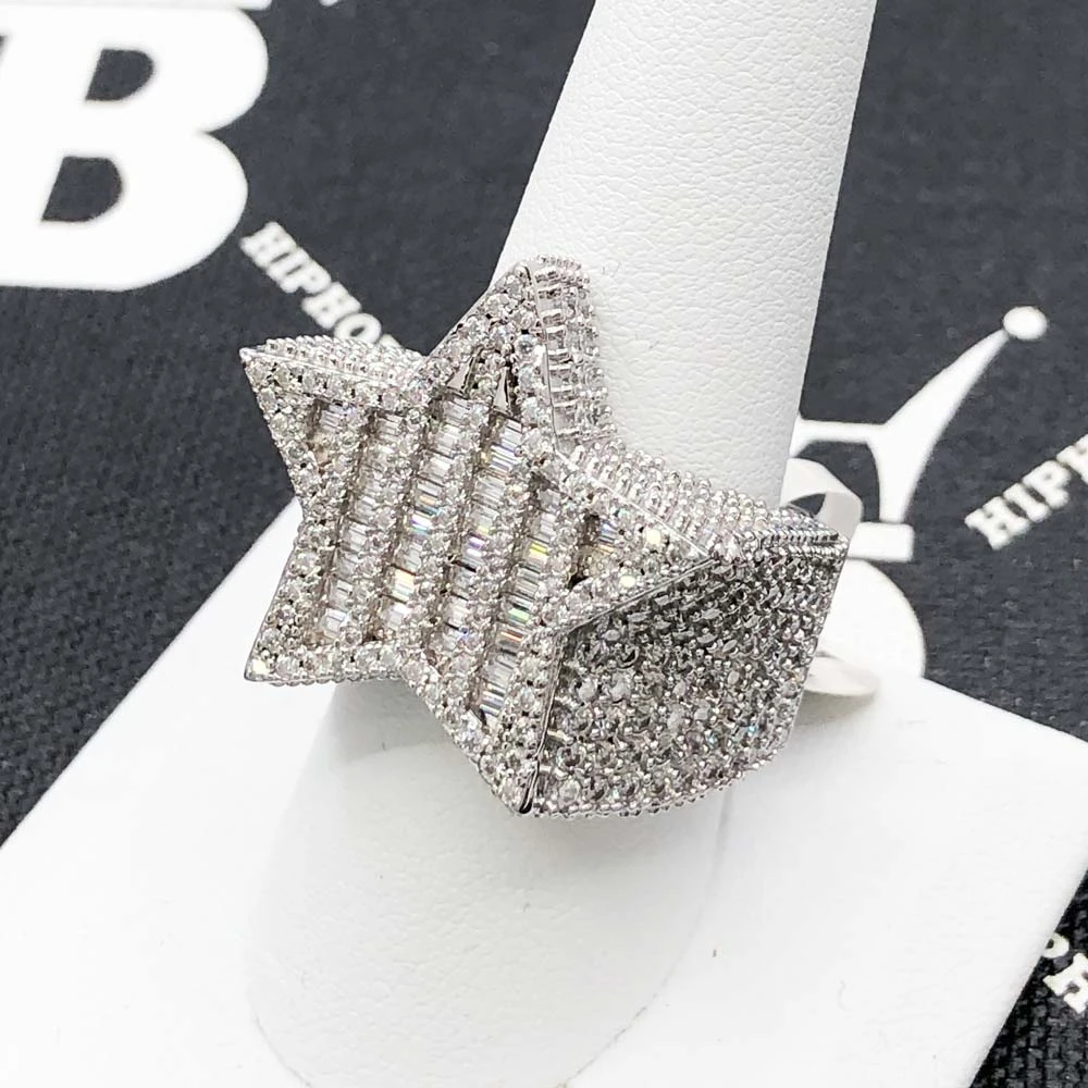 Baguette Star VVS Moissanite Ring .925 Sterling Silver. Features a polished comfort fitting solid back. This iced out Moissanite Star ring is simply breathtaking and displays an incredible bling bling shine. We insisted on using the finest Moissanite stones available to craft this perfect high end ‘diamond’ bling bling Moissanite Micro Pave unisex eternity band. Moissanite stones are carbon based stones just like real Diamonds. The benefit of our Moissanite hip hop jewelry is that you get a better shine for much less money than genuine Diamonds. Our Moissanite Stones have a higher refractive index than real Diamonds and rank 9-9.5 on Mohs hardness scale.