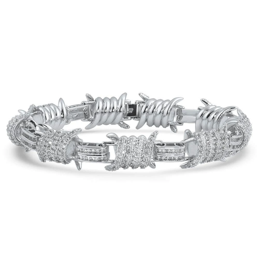 Barb Wire Baguette CZ Iced Out Hip Hop Bracelet. Classic and Unique Style Bling Bling Bracelet. 3D barb wire with 3D intricate details. Incredibly icy with VVS simulated diamond stones lighting up your wrist with the best shine possible. This iced out Bracelet shines like genuine diamonds. All hand setting, no glue. Hand Crafted to look, feel, and Shine Like Genuine Diamond Hip Hop Jewelry. Shine with the best hip hop jewels in the game.