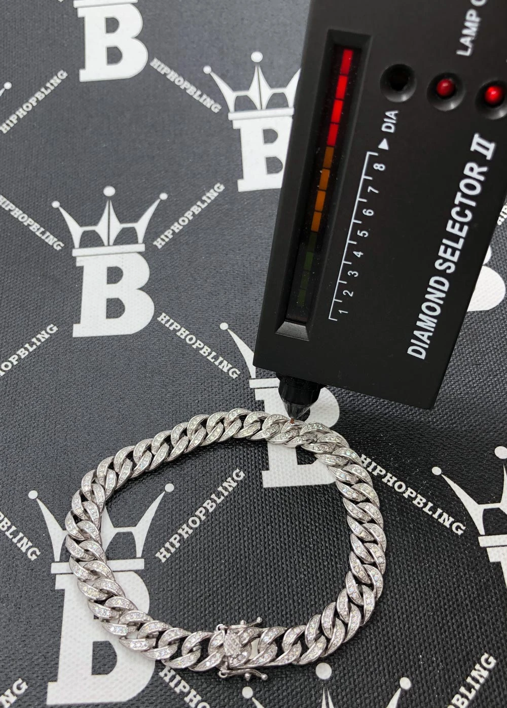 Cuban Moissanite Bracelet 8MM Iced Out .925 Sterling Silver. This iced out Cuban Bracelet is simply breathtaking and displays an incredible bling bling shine. We insisted on using the finest Moissanite stones available to craft these perfect high end ‘diamond’ Iced Out Cuban Link bracelets. Moissanite stones are carbon based stones just like real Diamonds*. The benefit of our Moissanite Cuban Link bracelets are that you get a better shine for much less money. Our Moissanite Stones have a higher refractive index than real Diamonds and rank 9.5 on Mohs hardness scale.