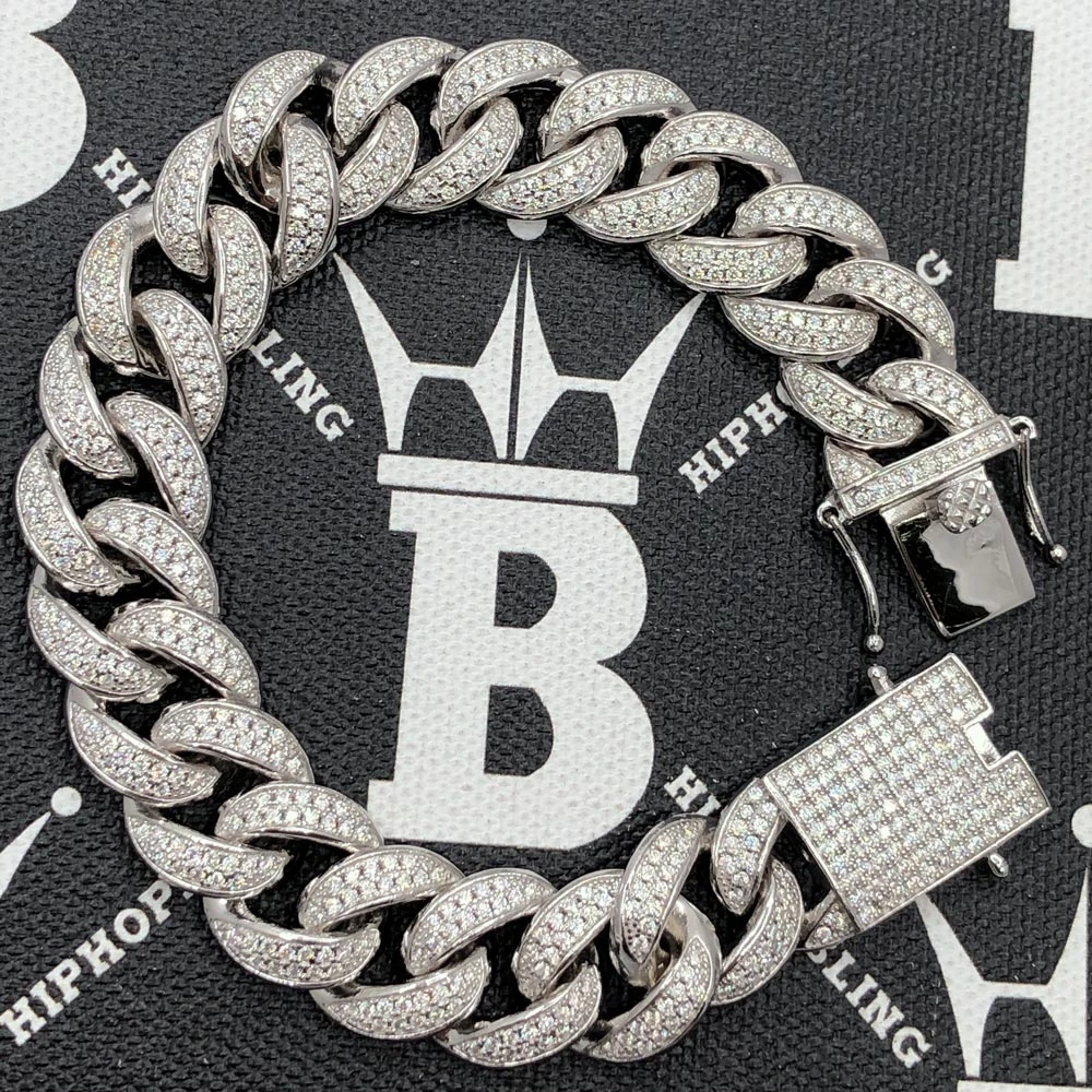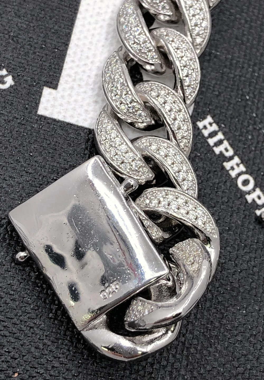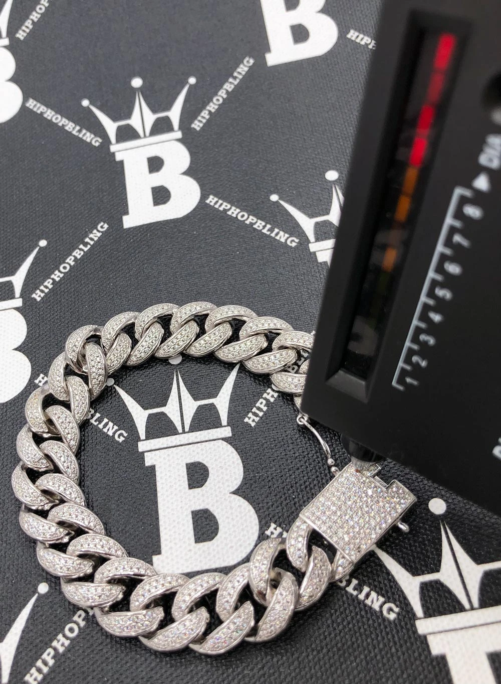 Cuban Moissanite Bracelet Iced Out Lock 15MM .925 Sterling Silver. This iced out Bracelet is simply breathtaking and displays an incredible bling bling shine. We insisted on using the finest Moissanite stones available to craft these perfect high end ‘diamond’ Iced Out Cuban Link bracelets. Moissanite stones are carbon based stones just like real Diamonds*. The benefit of our Moissanite Cuban Link bracelets are that you get a better shine for much less money. Our Moissanite Stones have a higher refractive index than real Diamonds and rank 9.5 on Mohs hardness scale.