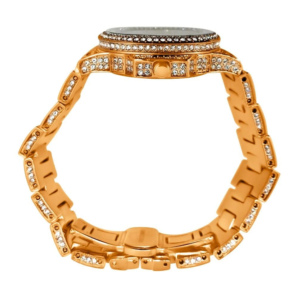 Bling Bling Rose Gold Fully Custom Ice Blizzard Watch. Incredible bling bling shine on this rose gold hip hop watch. Iced out with almost 1500 Simulated diamond Czech Crystal Stones covering the dial (baguette stone hour markers), bezel, side of bezel, lugs, case, band, and even the side of the band!. Incredible details with a luxury feel. Features a Stainless Steel Butterfly Clasp for that high end look and feel. This bling bling watch is made on a much higher quality level than the rest of the watches out there. Better, long lasting Rose Gold color, brighter shine, and full stone coverage. Order your Rose Gold Ice Blizzard Bling Bling Watch Today.