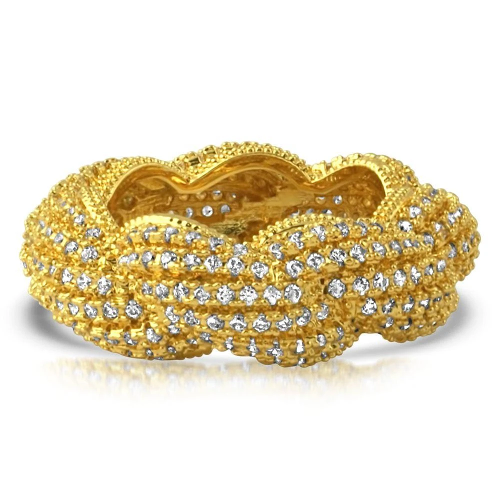 French Rope CZ Eternity Band Hip Hop Ring. Micro pave Prong Set CZ Simulated Diamond Stones. Quality made to look like fine jewelry. Very unique and rare, limited production. Yellow Gold or White Gold Wrapped to look and feel like solid gold for a fraction of the cost. Match this with your Diamond Rope Chain and Bracelet. Order today!