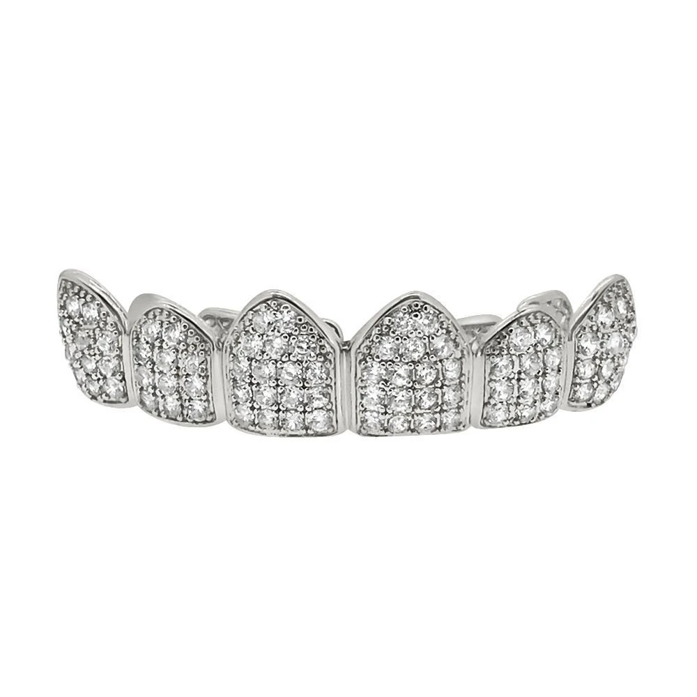 Iced Out Grillz for your Top row of teeth. New CZ Diamond bling bling grillz collection. These grillz were made to look like custom platinum diamond hip hop grillz that costs thousands of dollars. Get the look and feel of expensive custom grillz at a very low price. This grill is constructed from a high quality solid brass core and plated in a rhodium finish to give this grille a realistic and brilliant shine. Each high quality CZ fake diamond is hand set with prongs into the hiphop grillz for the best realistic shine. Each grillz can fit any teeth no matter how straight or crooked your tooth is. Thanks to our special custom fitting silicone mold mouth piece there is no need to send a mold back and forth through the mail. Easy to follow instructions are included to wear your mouth grillz in minutes! The good thing about these grills is that they are removable, you can wear the grill or remove it easily. Grillz come in a nice box to store in. Best Grillz – Made in Korea **Disclaimer** These grillz are intended for decoration and entertainment purpose only. The grillz are not intended to use while eating, drinking exercising. Grillz cannot be worn over braces. These products are sold as it is without warranties of any kind. Due to the nature of this product, no returns or exchanges are allowed so please be aware of that prior to ordering. We will not be liable for any damages of any kind arising from the use of these grillz including but not limited to incidental, punitive or accidental damages. *** Beware of knockoff Grillz made in China that you see for cheap prices. Those cheap imitation Grillz can be toxic and dangerous to wear and may lead to tooth loss.