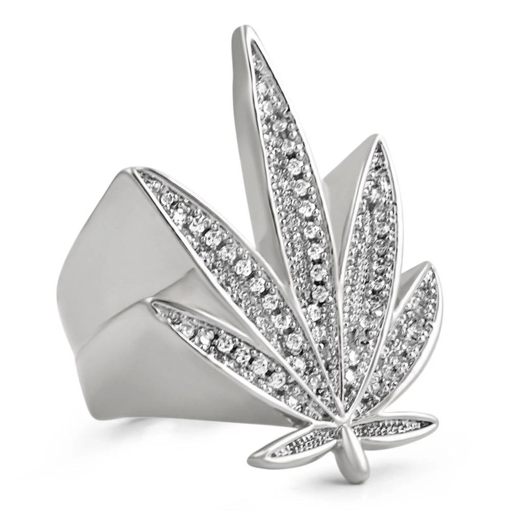 Marijuana Leaf 420 CZ Bling Bling Rhodium Ring