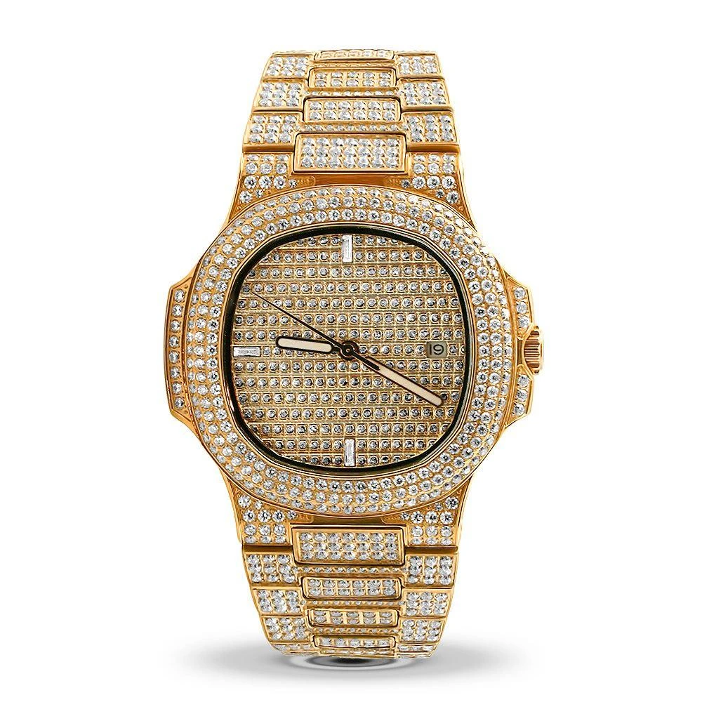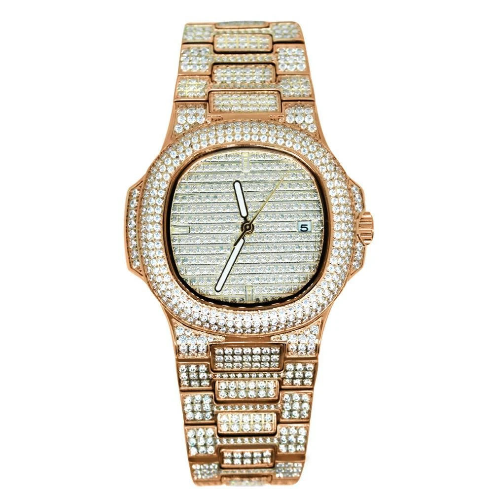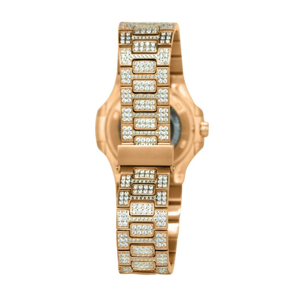High End Modern Hip Hop Bling Bling Watch. Crafted from Stainless Steel Metal for long lasting durability. Each stone is set by machine for precise beautiful stone setting that will leave you breathless. High tech Rose Gold bonding will make this watch last and last. Stay iced up with this popular style bling bling watch around your wrist. Quality made so it looks like you got $75k on your wrist. Order yours today as stock is limited.