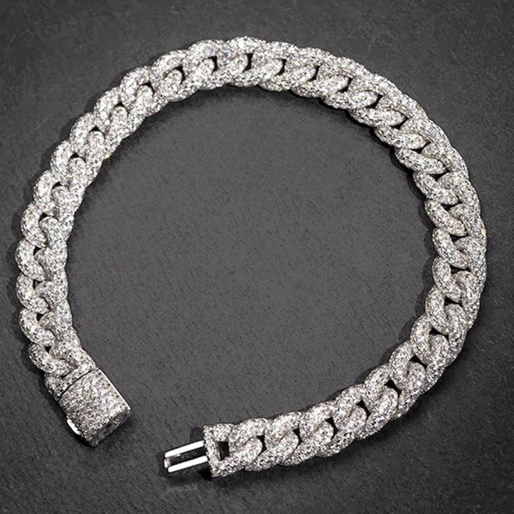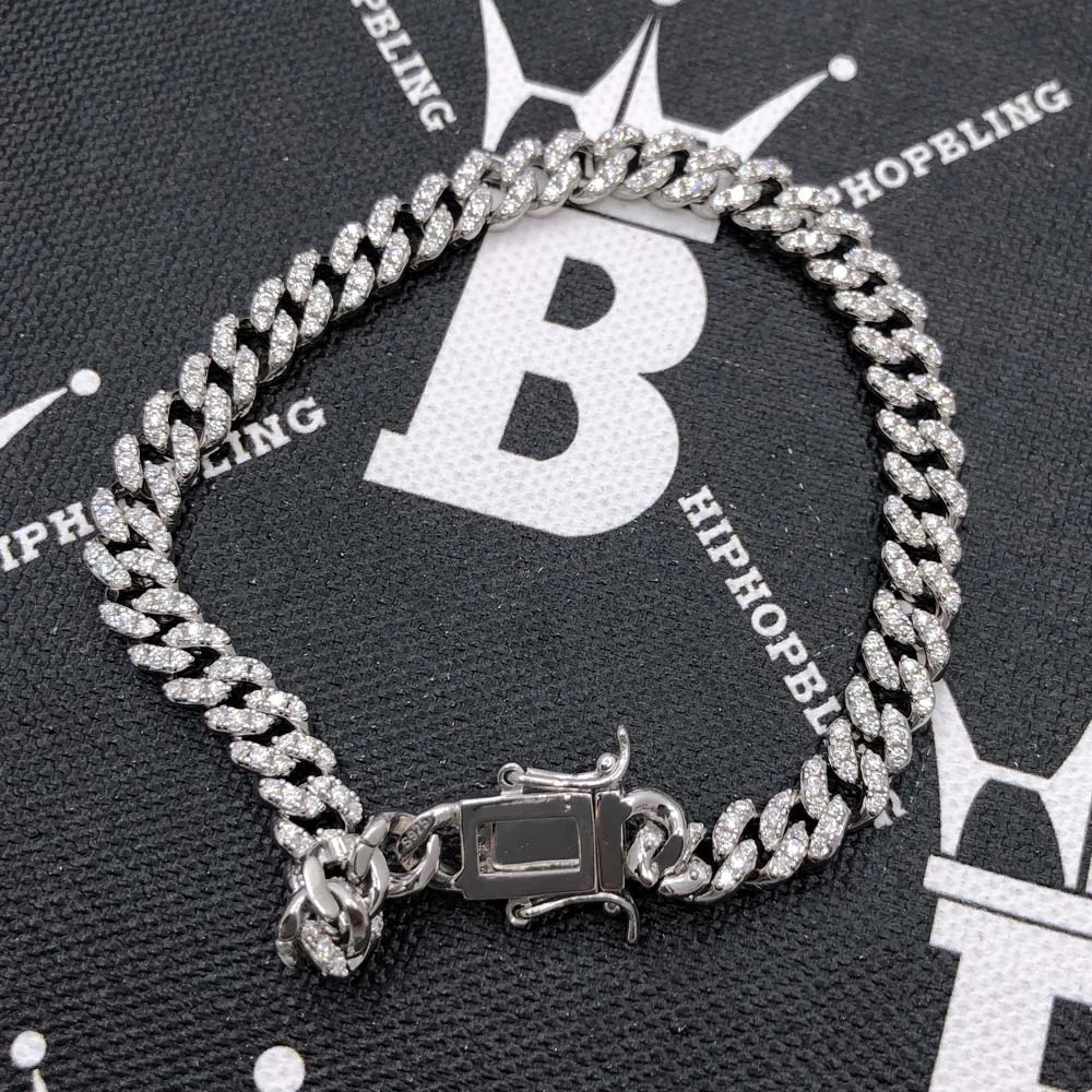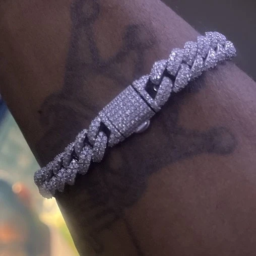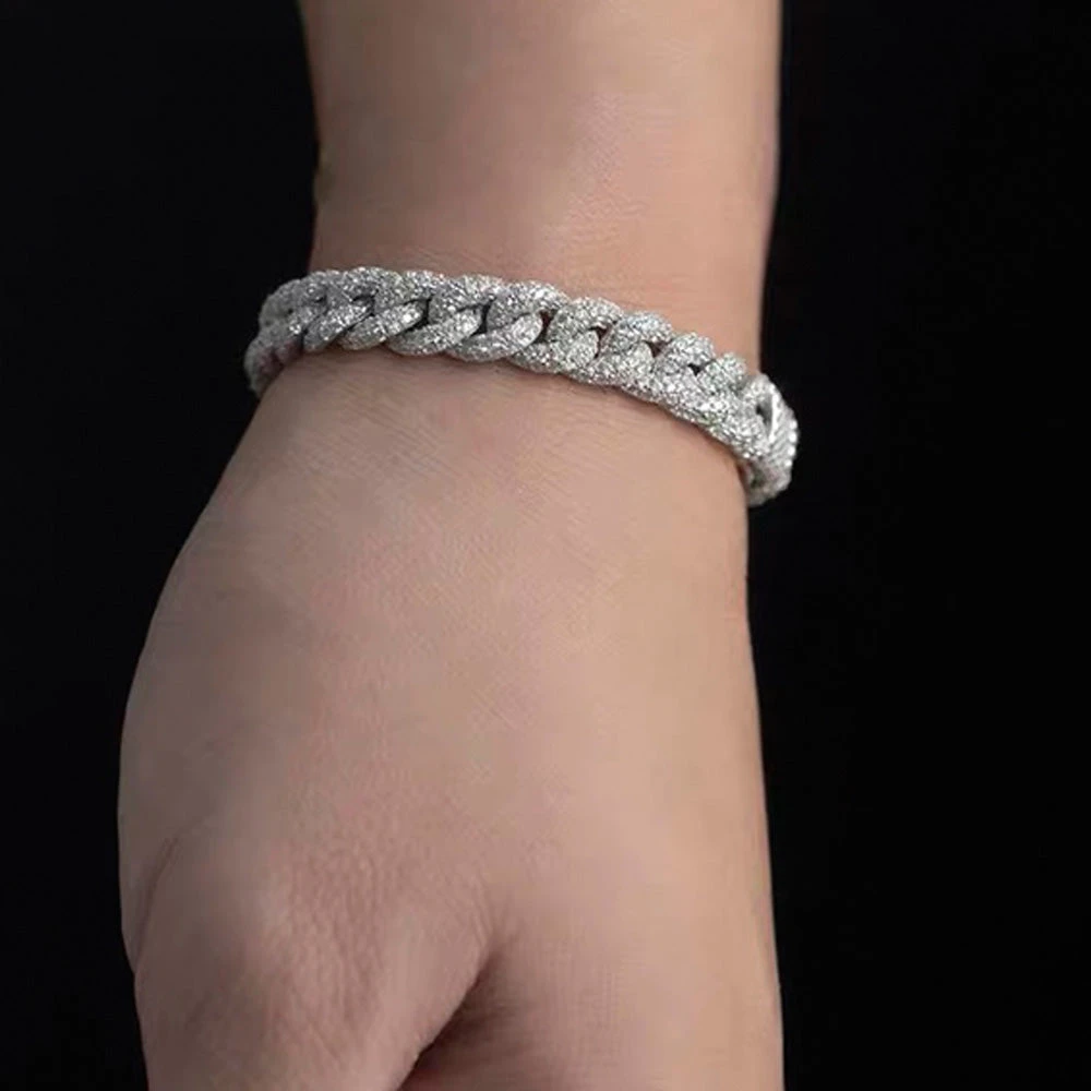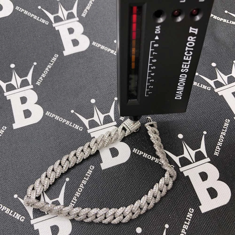 Moissanite 2 Row Cuban Link Iced Out Bracelet 9MM .925 Sterling Silver. This iced out Cuban Bracelet is simply breathtaking and displays an incredible bling bling shine. We insisted on using the finest Moissanite stones available to craft these perfect high end ‘diamond’ Iced Out Cuban Link bracelets. Moissanite stones are carbon based stones just like real Diamonds*. The benefit of our Moissanite Cuban Link bracelets are that you get a better shine for much less money. Our Moissanite Stones have a higher refractive index than real Diamonds and rank 9.5 on Mohs hardness scale.