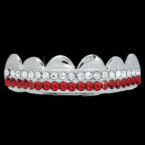 RED / CLEAR Double Bar SILVER Iced Out Grillz Hip Hop Bling Grills TOP
