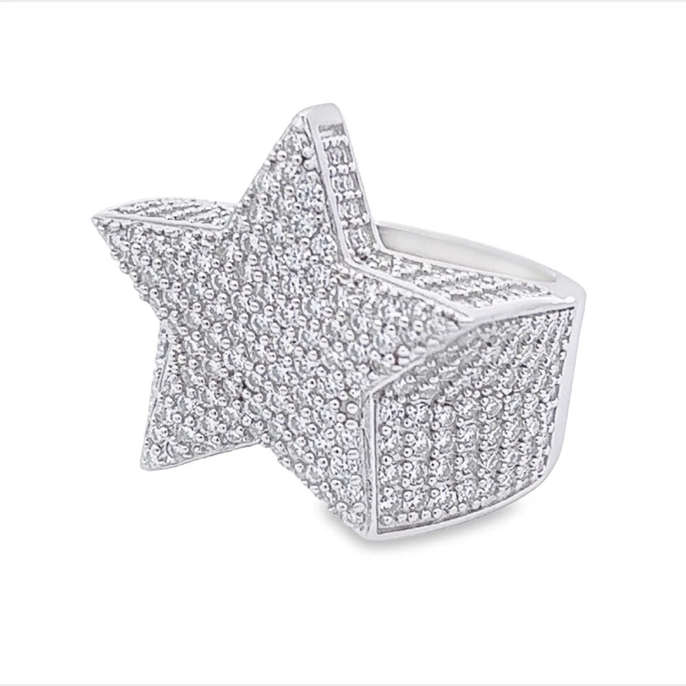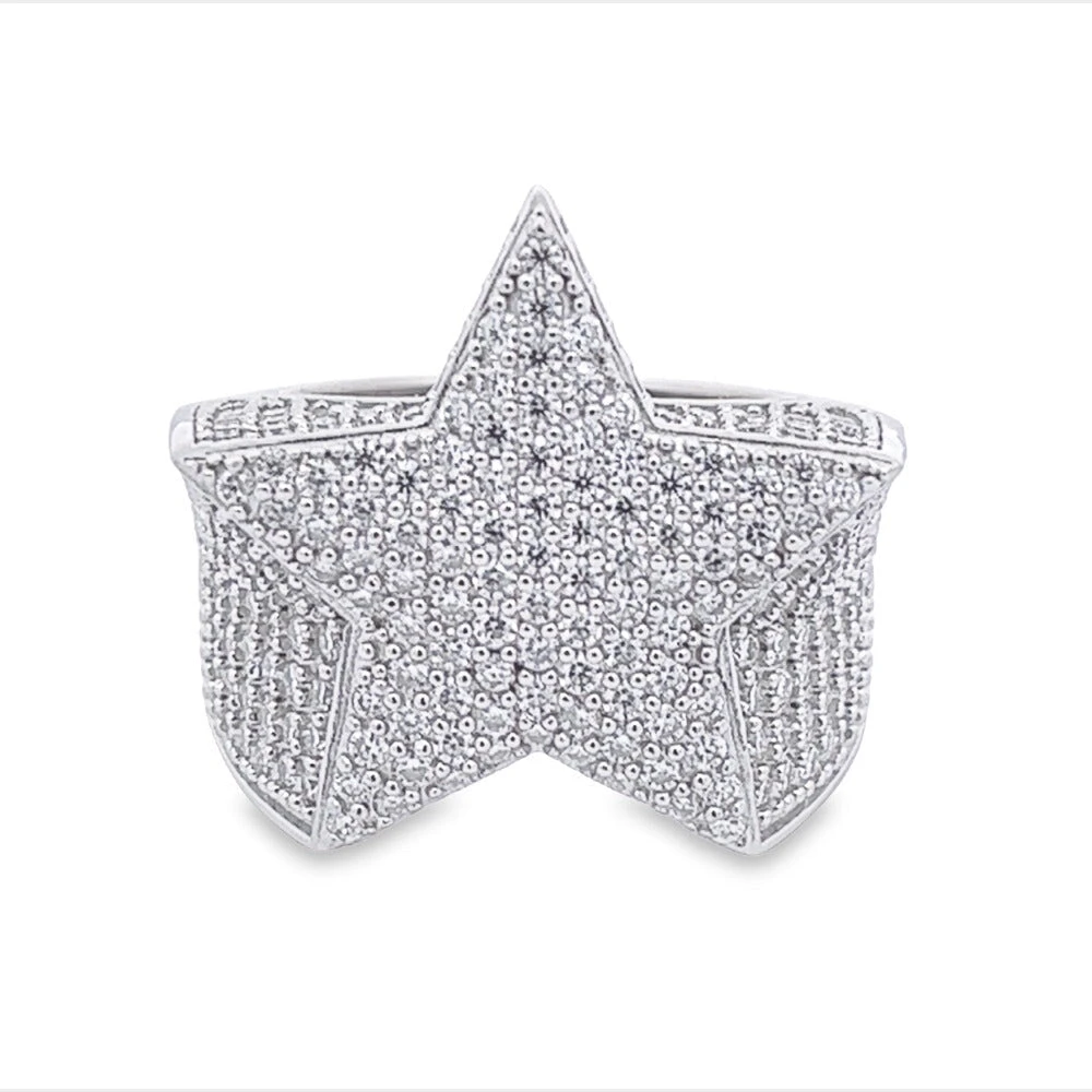 Star Iced Out VVS Moissanite Ring .925 Sterling Silver. This iced out Moissanite Cuban link ring is simply breathtaking and displays an incredible bling bling shine. We insisted on using the finest Moissanite stones available to craft this perfect high end ‘diamond’ bling bling Moissanite Micro Pave iced out ring. Moissanite stones are carbon based stones just like real Diamonds. The benefit of our Moissanite hip hop jewelry is that you get a better shine for much less money than genuine Diamonds. Our Moissanite Stones have a higher refractive index than real Diamonds and rank 9-9.5 on Mohs hardness scale.